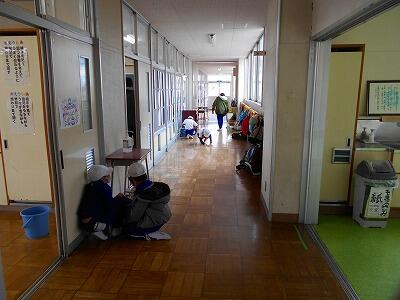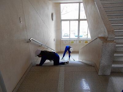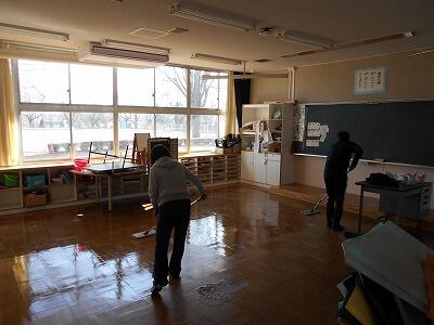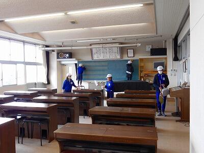 机や椅子を教室から運び出した後、広くなった教室を掃除しました。