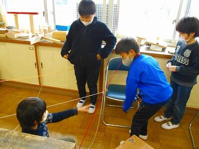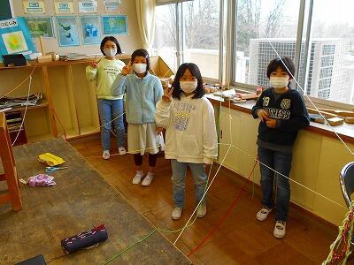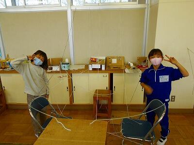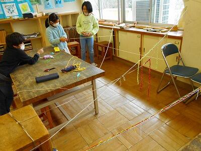 子どもたちは、進んで室内をカラフルな糸で張り巡らせていました。