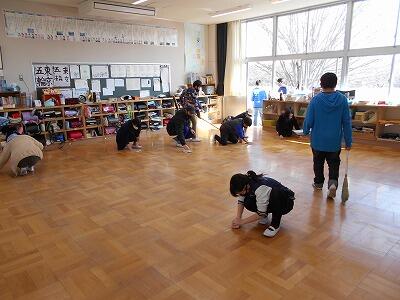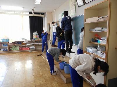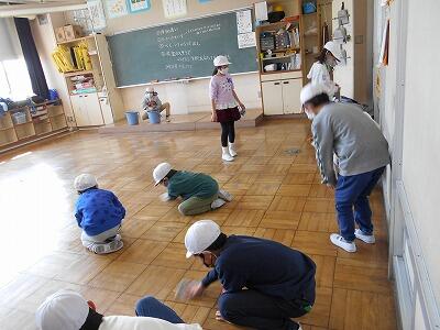 お世話になった教室を美しい環境に整えようと、子どもたちは一生懸命床を雑巾で水拭きしたり、気づいたところを進んできれいにしたりするなどよくがんばっていました。