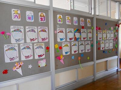 また、学級活動の時間に作成した「6年生へのメッセージ」を廊下に飾っていました。