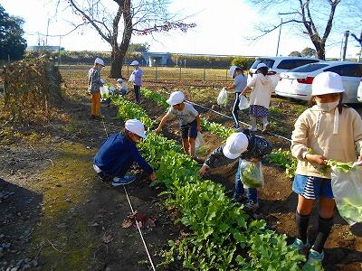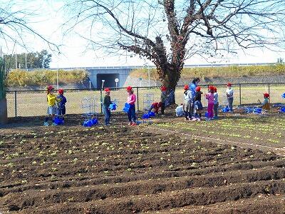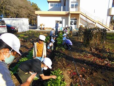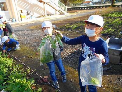 生活科の学習で、先月植えた「葉大根」の収穫をしていました。