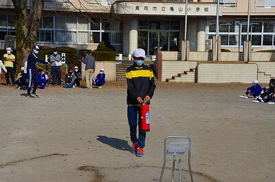 避難完了後は消防士さんからお話を聞いたあと、4~6年代表児童が水消火器を使って消火体験をしました。