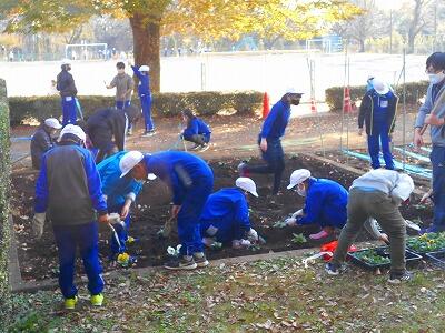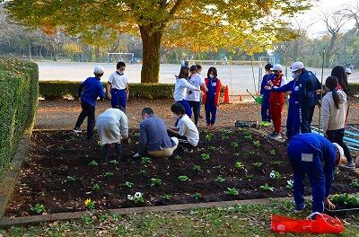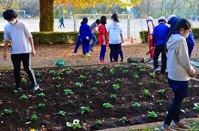 11月17日火曜日、6年生が花壇にチューリップの球根植えとパンジーの苗植えをしていました。