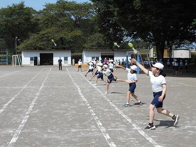 体育の学習で「ボール投げ遊び」をしていました。