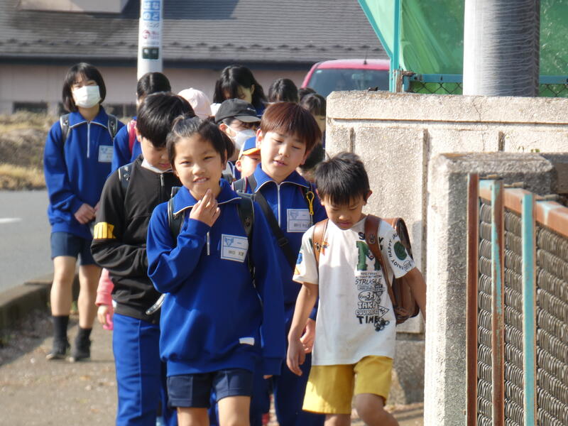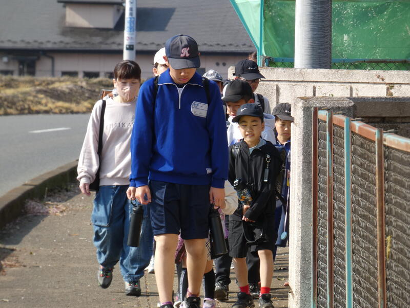 朝の登校の様子です。昨年同様、1年生の歩み合わせて、班長さんを先頭に、ゆっくりとした歩調で登校しています。