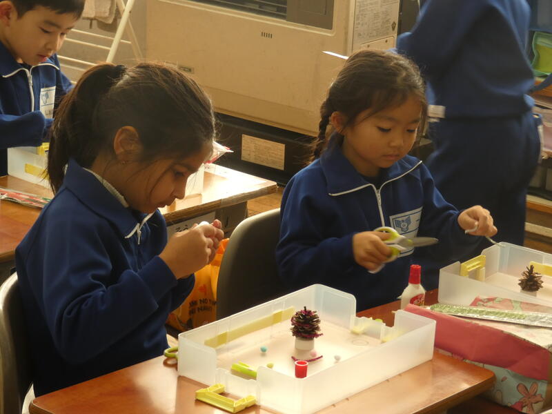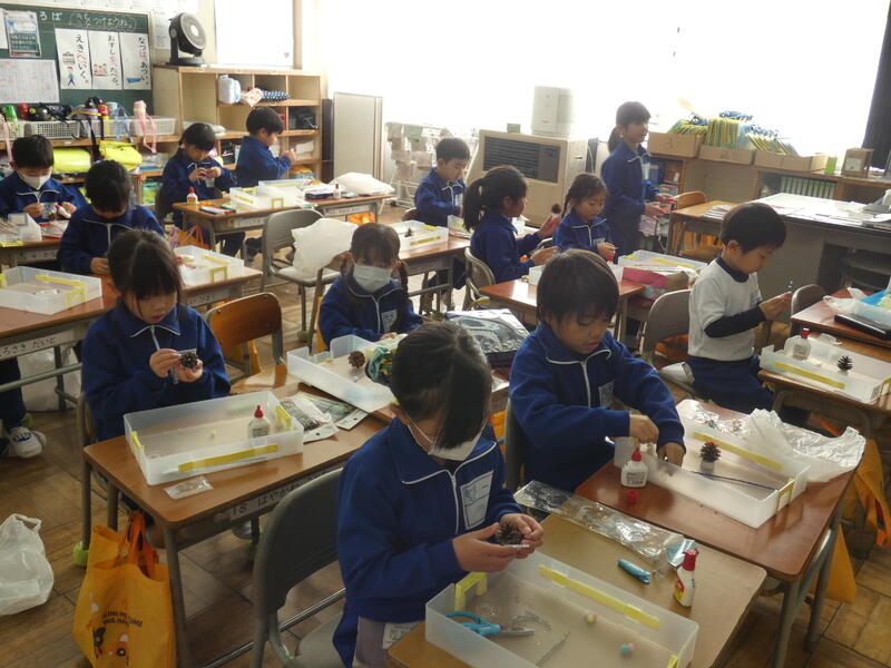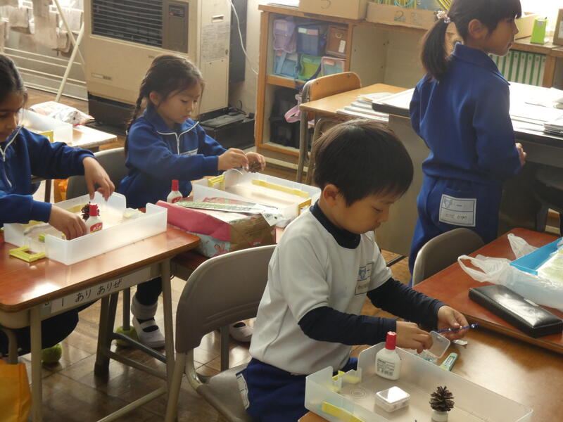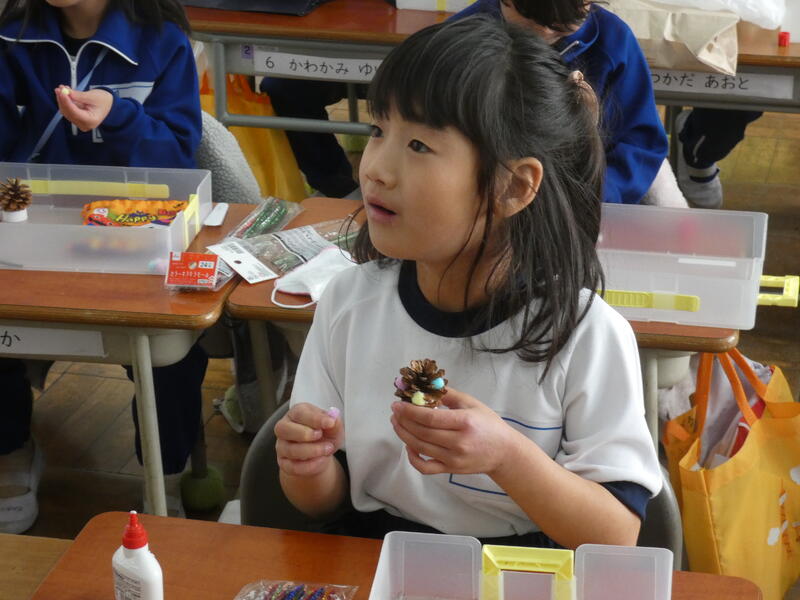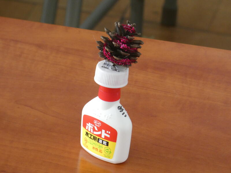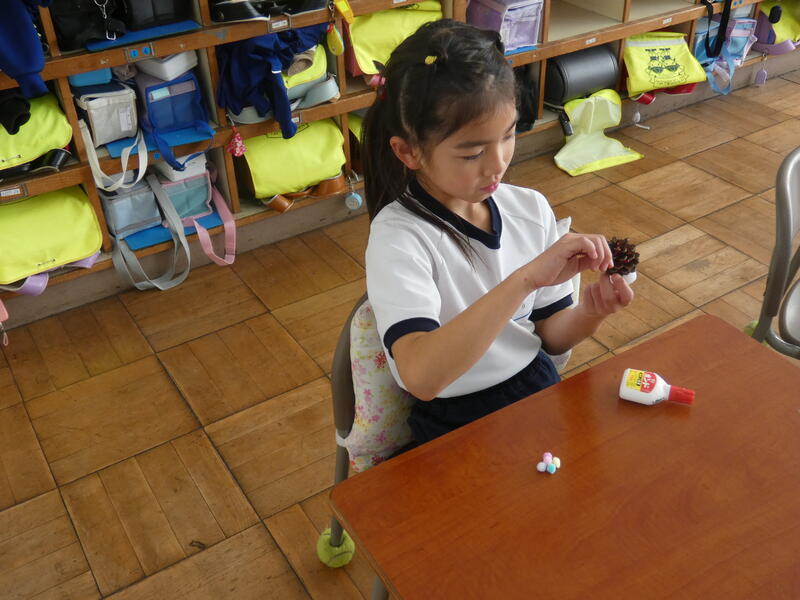 1年生が松ぼっくりを使って、ミニミニクリスマスツリーを作っています。
