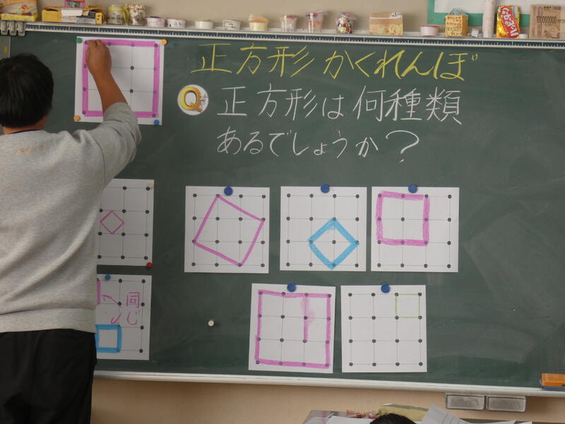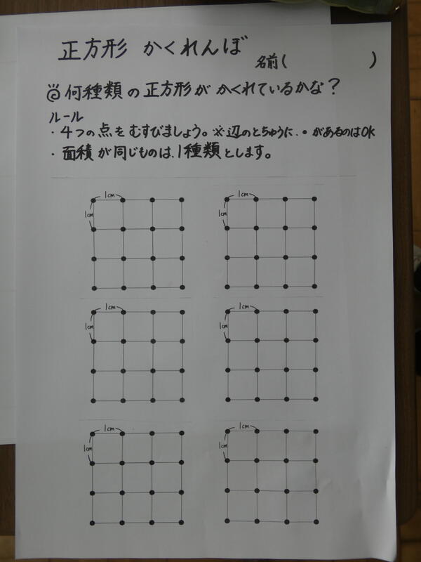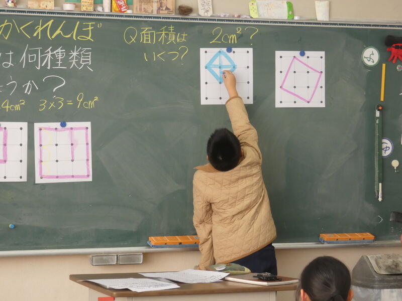 一辺の長さの分からない正方形の面積を、与えられた条件下(1平方センチメートルの正方形のみ表示)でどう求めるかを考える授業でした。