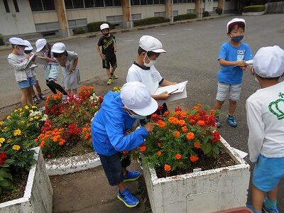1組は国語「かんさつして書こう」の単元で、観察メモの取り方を学習していました。マリーゴールドやサルビアの花を観察し、わかったことを短くメモにまとめていました。