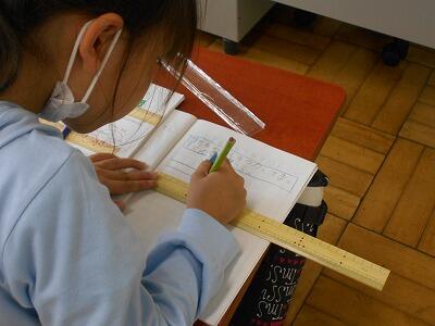 本時のめあては「竹ものさしをつかってまっすぐな線をひこう」です。