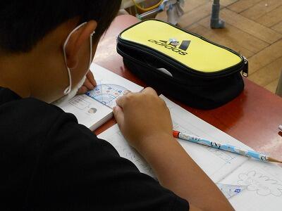 5年生は算数「合同な図形」の学習をしていました。実際に作図しながら、何がわかれば合同な三角形が作図できるのか、必要な条件についてよく考えていました。
