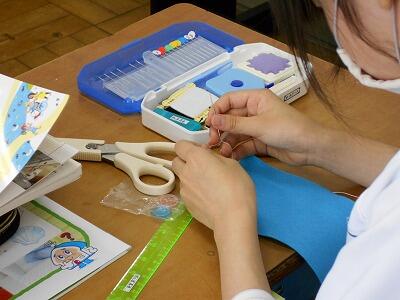 2組は家庭科で「はじめてみよう、ソーイング」の学習をしていました。