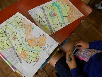 生活科で亀山地区について調べていました。地図に書き込みながら、亀山地区には田んぼや林が多いところ、家が多いところ、工場が多いところがあることがわかりました。