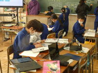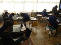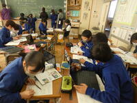 同じ課題の友達とグループになり、協力しながら一生懸命調べています。