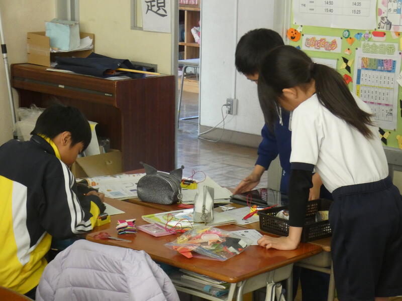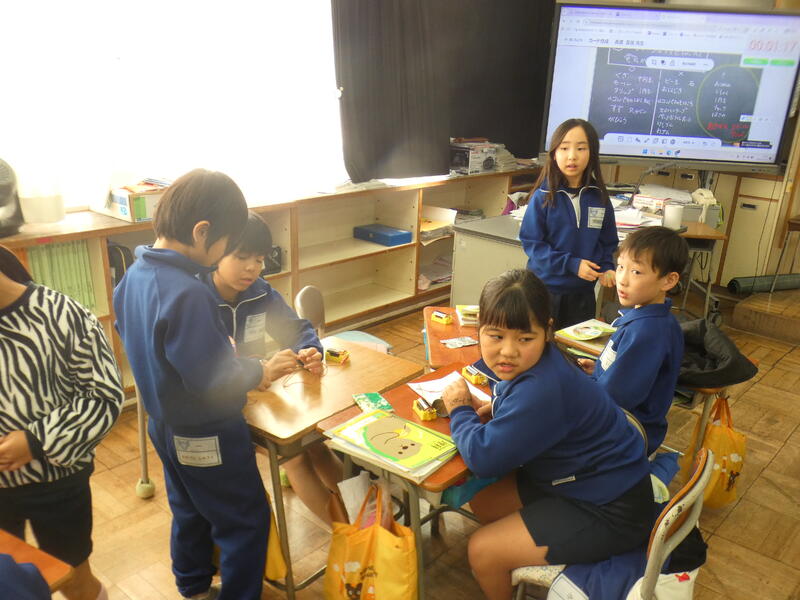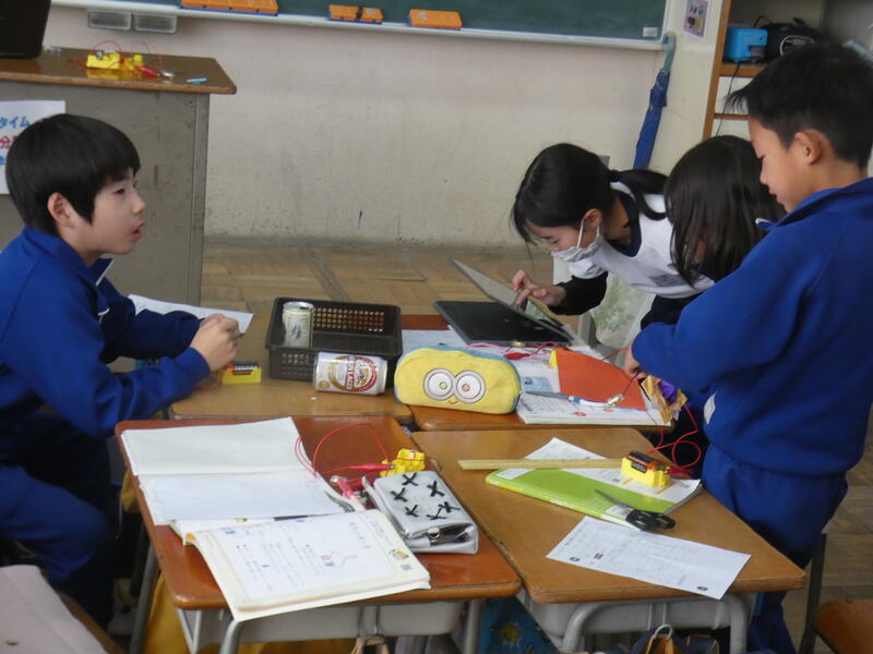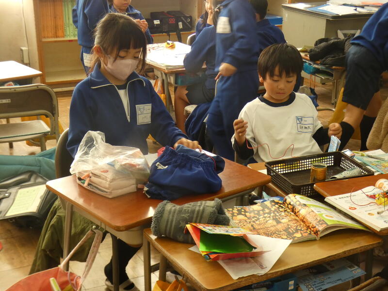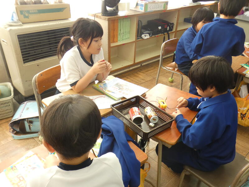 「おっ、この折り紙は電気を通すぞ」「はさみの持つところは電気がつかないよ」「ボールペンの持つところもつかない」「机の脚のところはつくよ」
