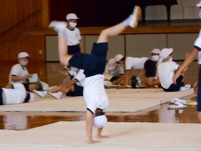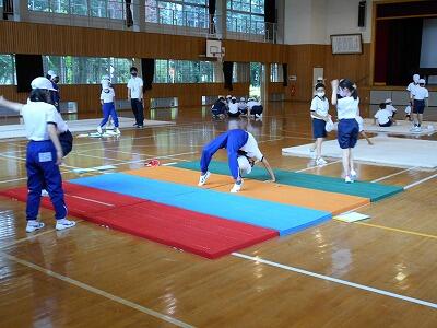 体育でマット運動の学習をしていました。