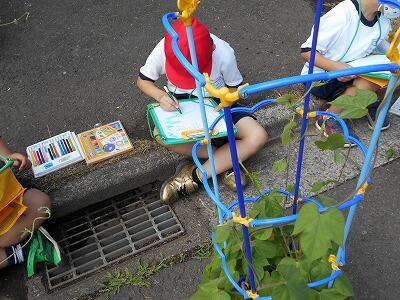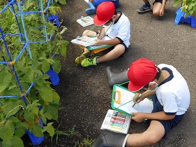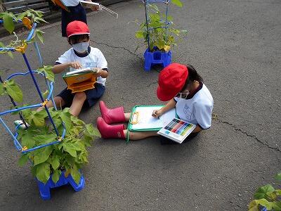 生活科の学習で、育てているアサガオの観察をしていました。