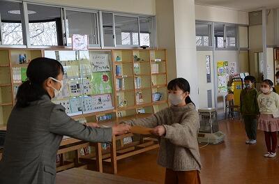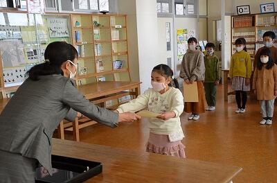 はじめに、終業式の前に表彰がありました。絵画の各種コンクールで入賞した児童を表彰しました。表彰されたみなさん、おめでとうございます。