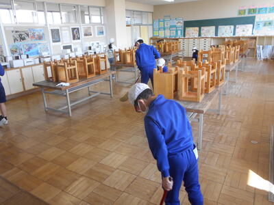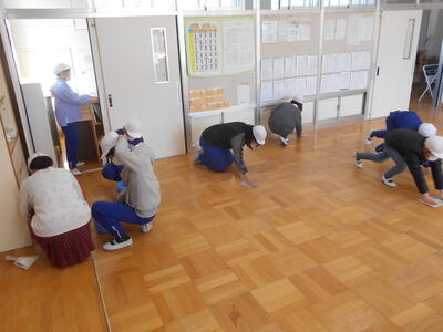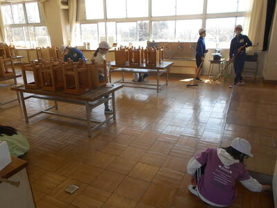 子どもたちは、机や椅子を廊下に運び、一生懸命床ぶきしました。