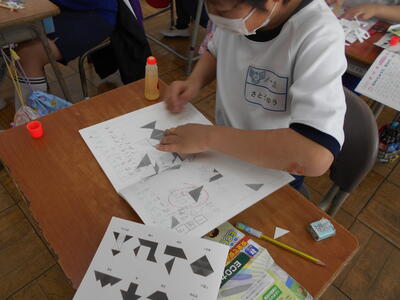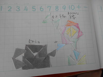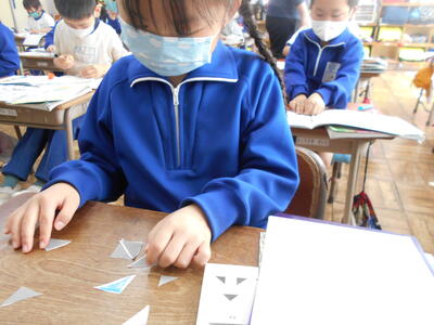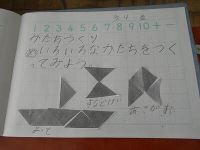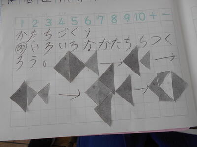 今回は、三角形の図形を組み合わせていろいろなかたちを作っていきました。
