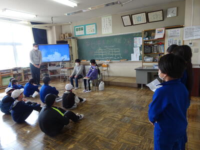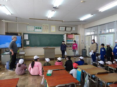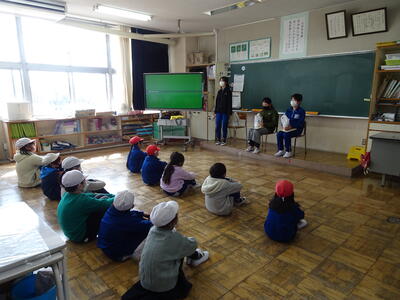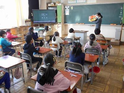 3月7日月曜日、業間に朝会がありました。図書室と各教室をつないで行いました。