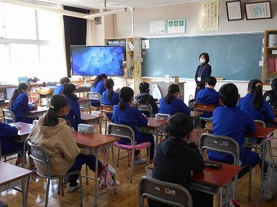 3校時に、図書室と各教室をオンラインでつないで行いました。