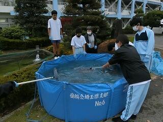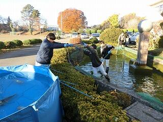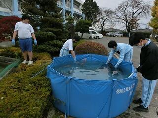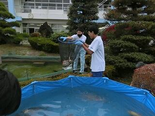 《1-3,2-3》 自立活動 清掃した池に鯉を戻しました
