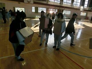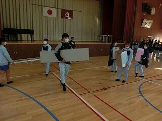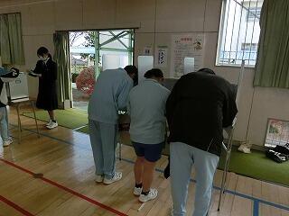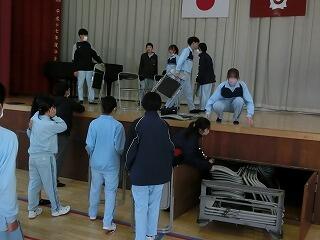 生t会役員選挙の準備の様子です。体育館に記載台や投票箱を準備し、立会演説会のためのステージをつくっていました。