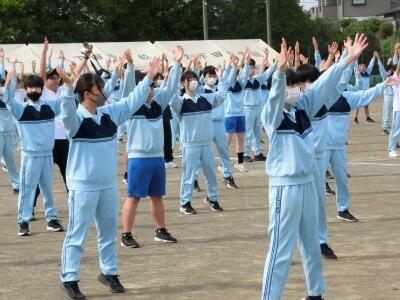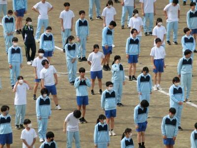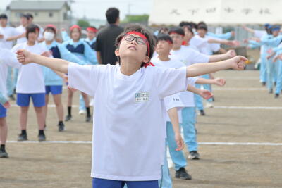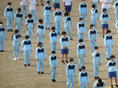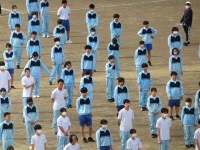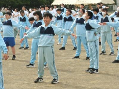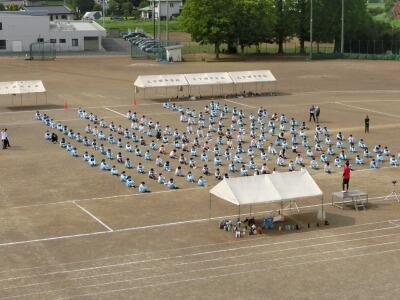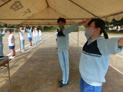 運動会の全体練習の時間。並び方やラジオ体操を確認しました。