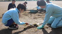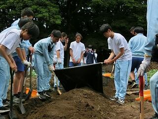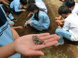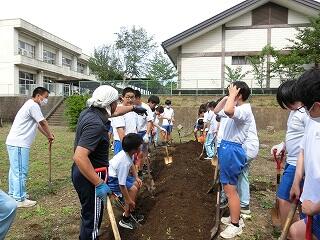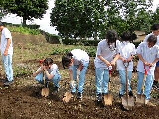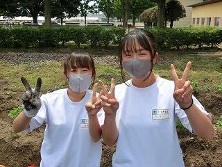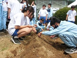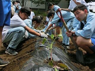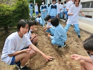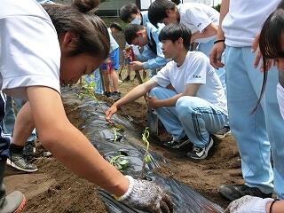 2年生の技術の授業・生物の生成では農園づくりを行っています。畑に畝をつくりマルチをかけ、さつまいもの苗を植えました。