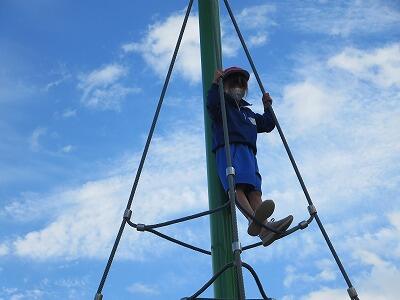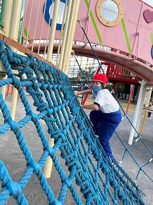 プレゼントした松ぼっくりけん玉を教えてあげたり、自然の葉や枝であそんだり、遊具で遊びました。