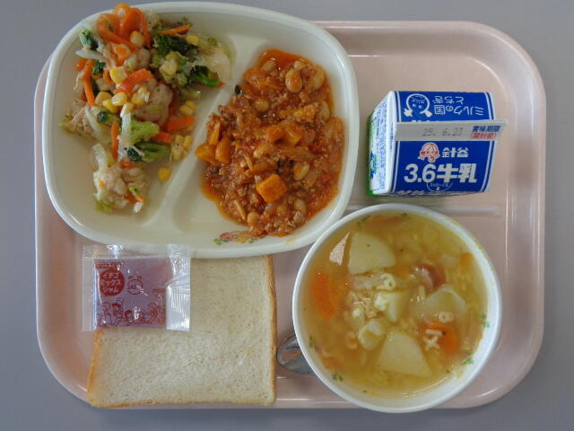 スラッピージョー(コッペパン) 牛乳 スラッピージョーの具 カラフルサラダ 野菜のポトフ