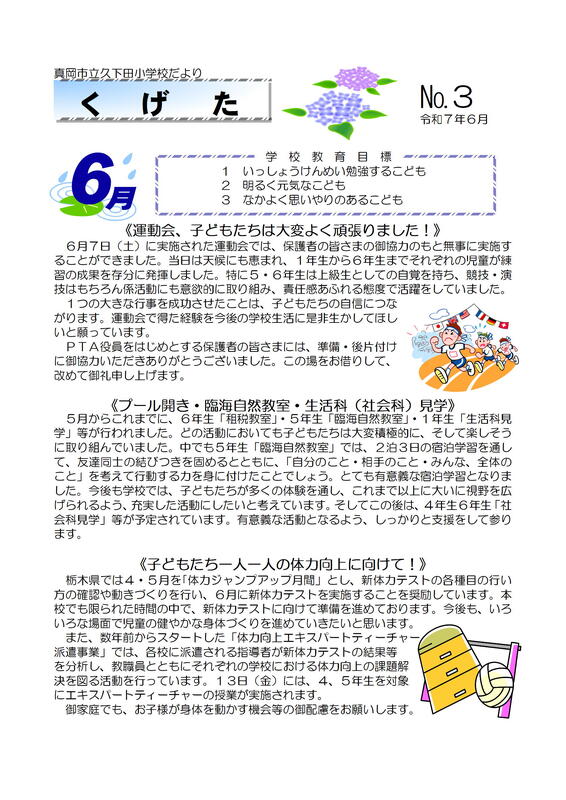 来週も子供たち一人一人をしっかり見つめ、職員一同力を合わせて教育活動に臨んで参りますので、保護者の皆様におかれましても、引き続き御支援・御協力を賜りますようよろしくお願いいたします。