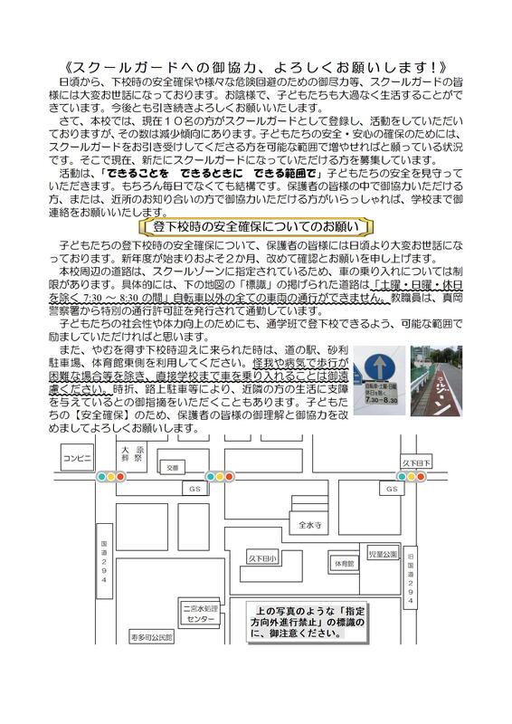 ②お子様の登下校時の職員駐車場への自家用車の乗り入れにつきましては、学童保育関係の送迎車、またはお子様の病気や怪我、その他何らかの緊急時以外は御遠慮いただいております。子供たちの安全を最優先にしてのことですので、よろしくお願いいたします。