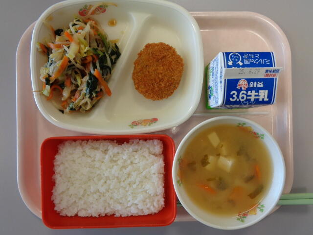 ごはん 牛乳 牛肉やきコロッケ・ソースかけ 五目きんぴら ちゃんこ汁
