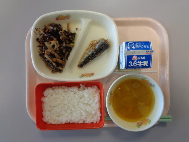 ごはん 牛乳 いわしのおかか煮 ひじきとれんこんの磯煮 ほうとう汁