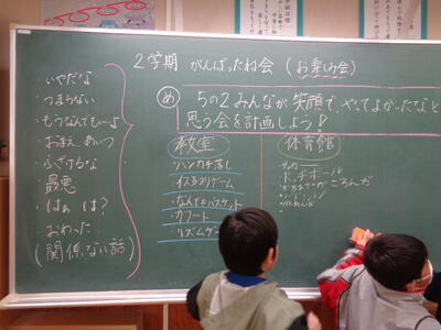 ★「2学期がんばったね会(お楽しみ会)」について、司会の児童を中心に、子供たちはワクワクした表情を見せながら、とても積極的に自分の考えを発表していました(#^.^#)。