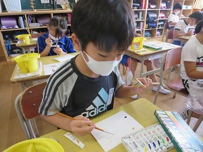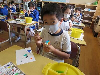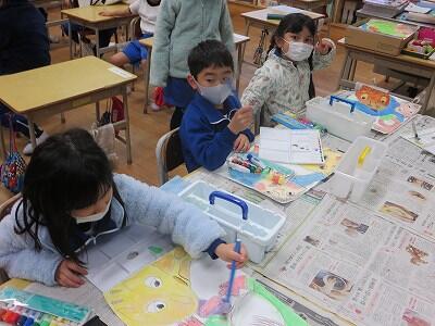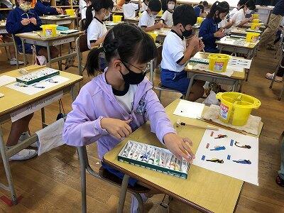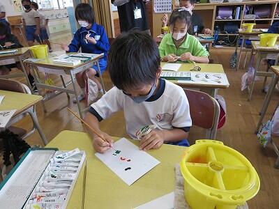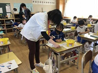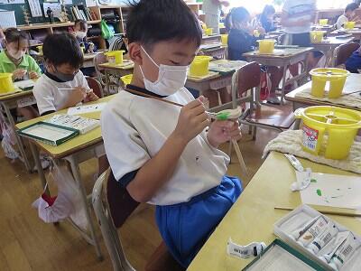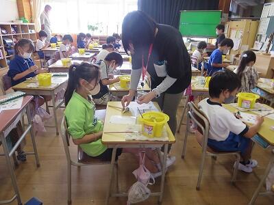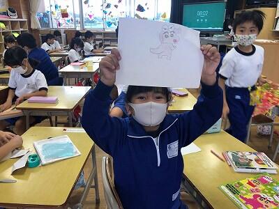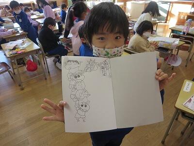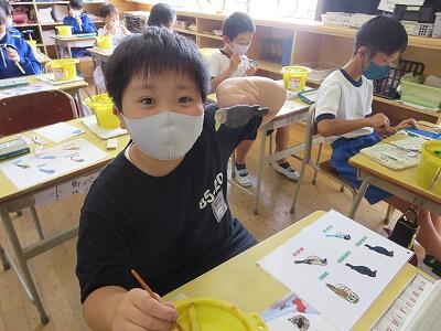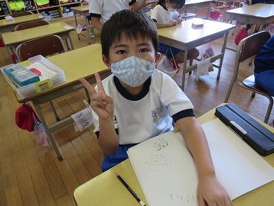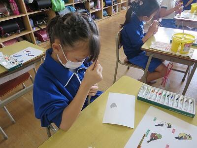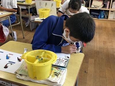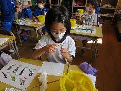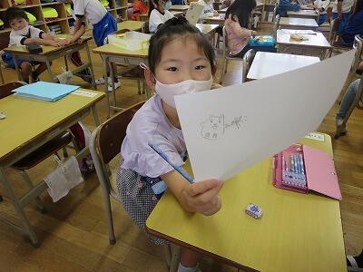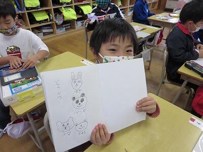 1年生の図工の授業です。「動物園の絵」を描いています。