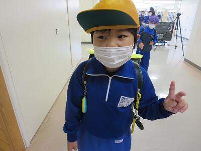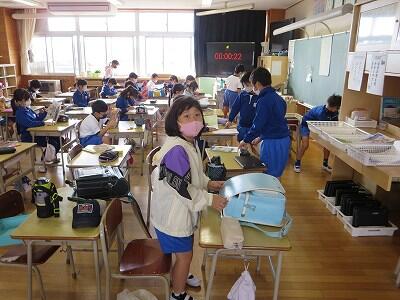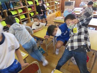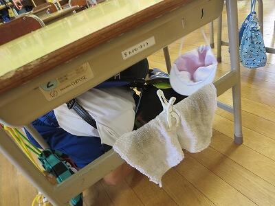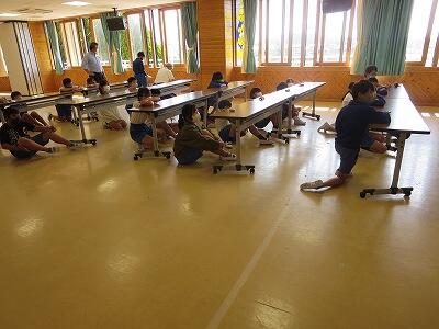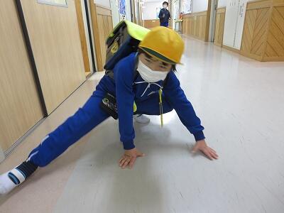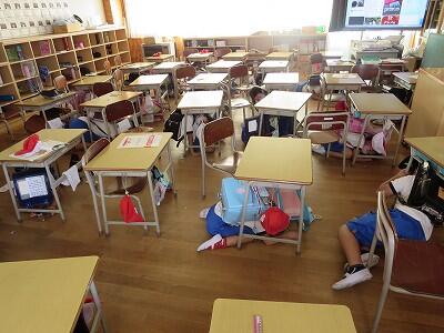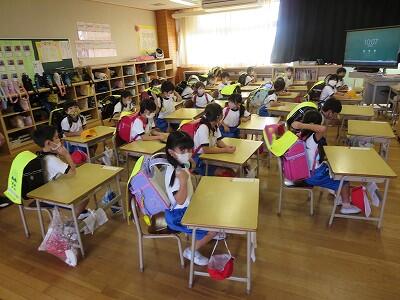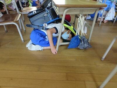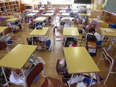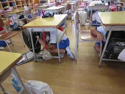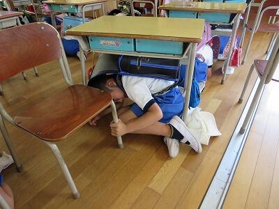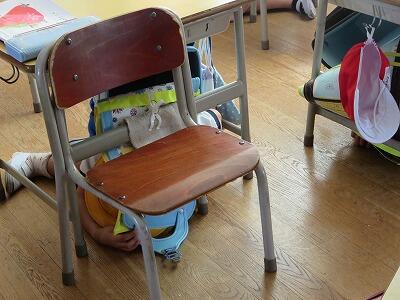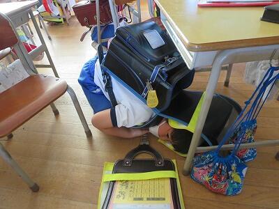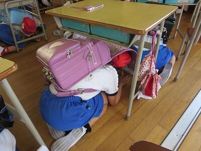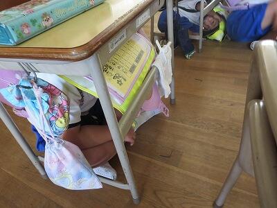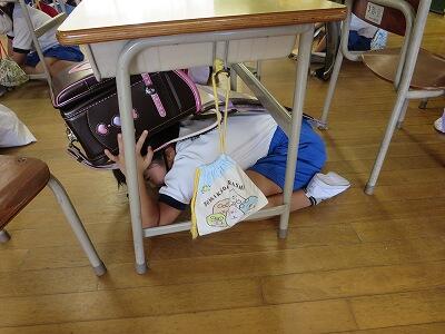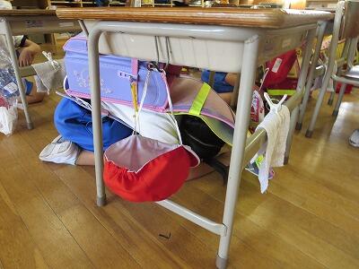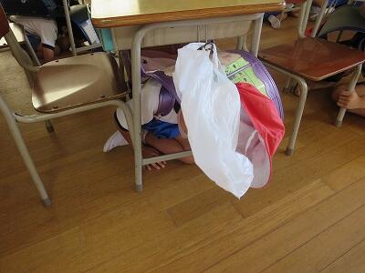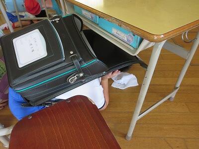 次に、ランドセルをかぶり、机の下にかくれること。