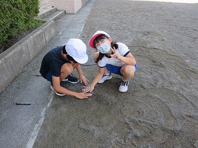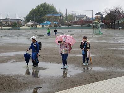 水たまりの校庭を歩く子どもたちでした。