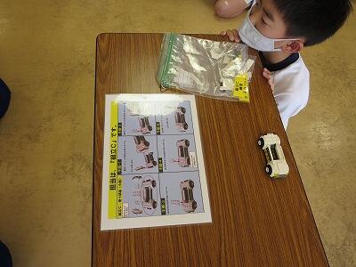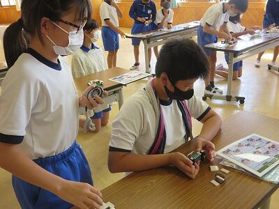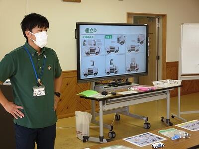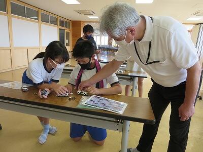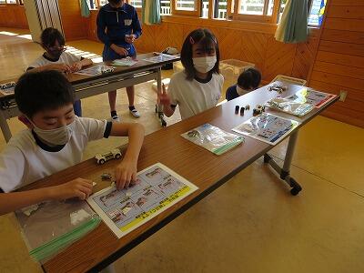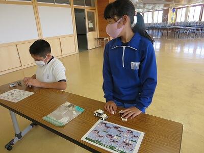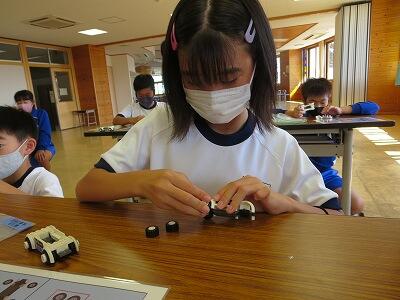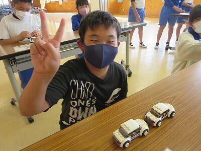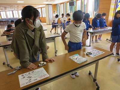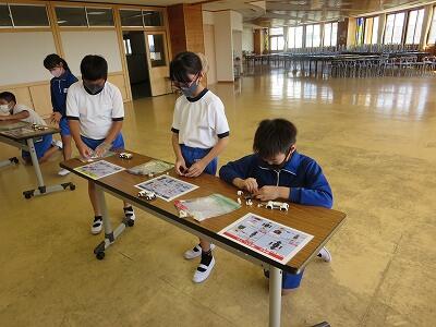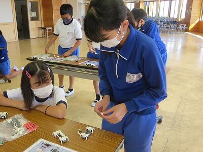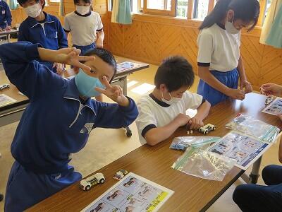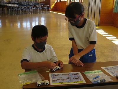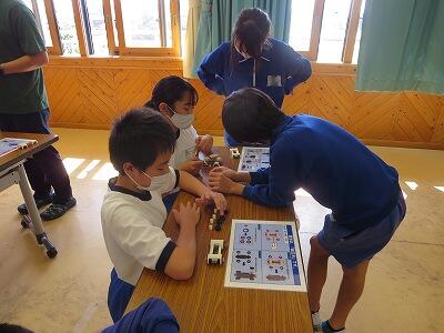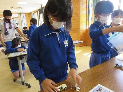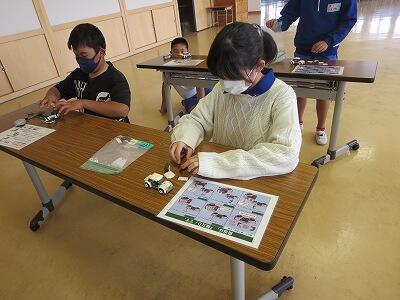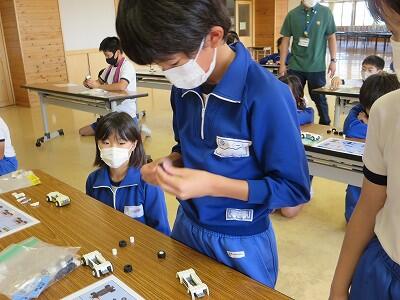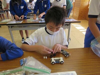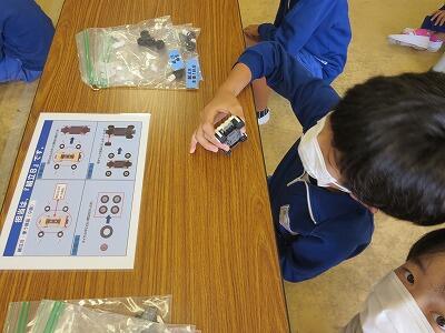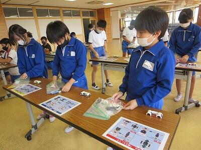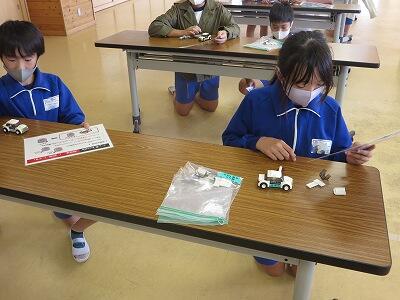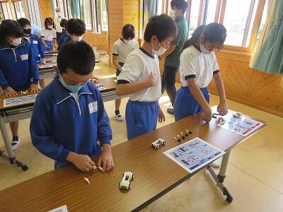 班ごとに、模型の部品を組み立て、1台の自動車を完成させていきます。