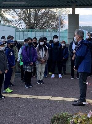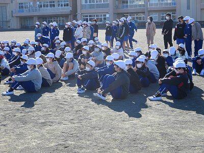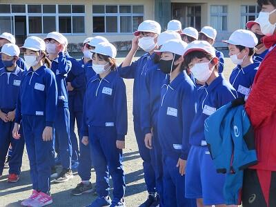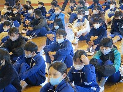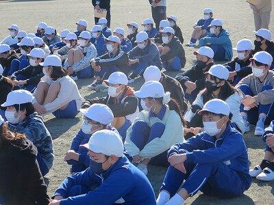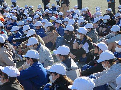 校内放送による校長先生の講評を聴いています。