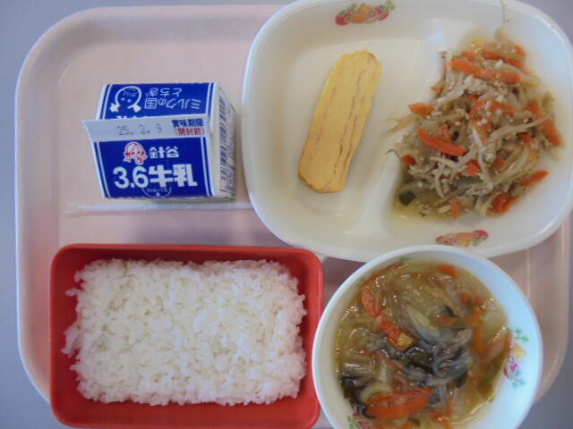 ごはん 牛乳 厚焼き玉子 セルフビビンバの具 わかめと春雨のスープ
