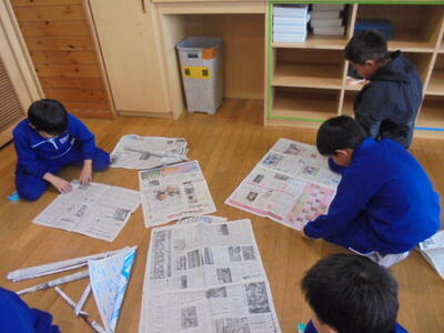 ★4年1組「図工」では、新聞紙を細く長く巻きながら、棒状に作り上げていました。
