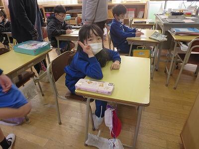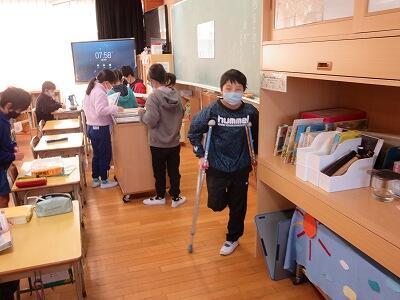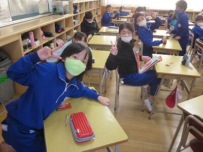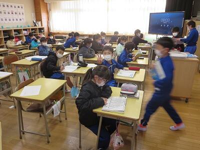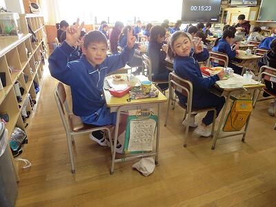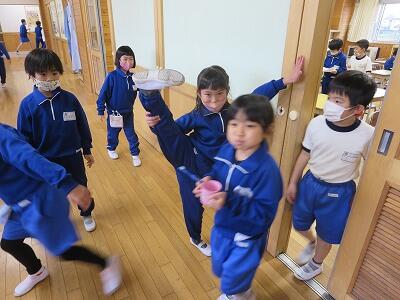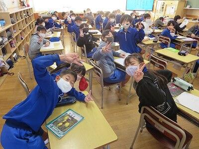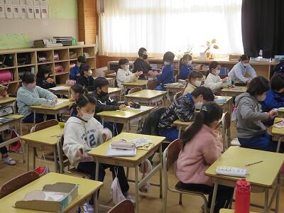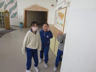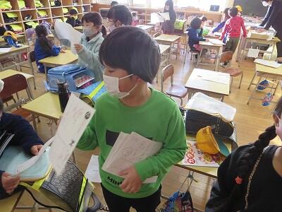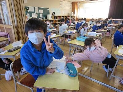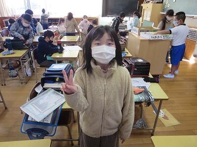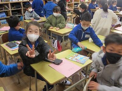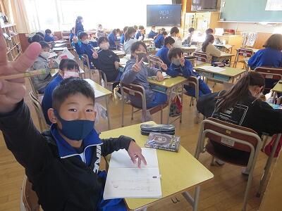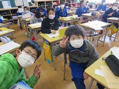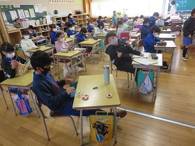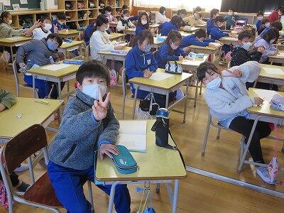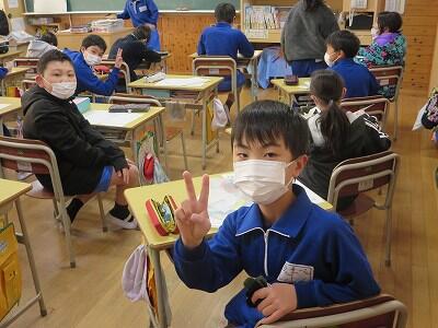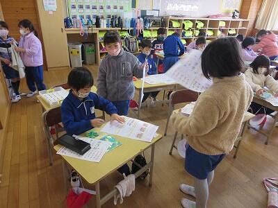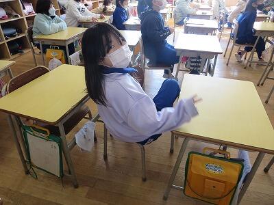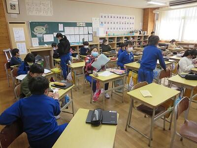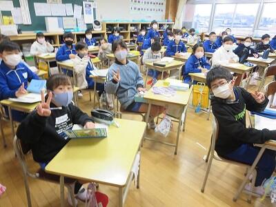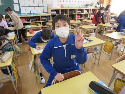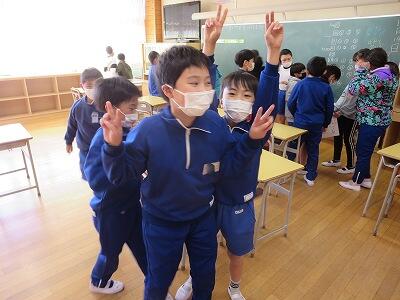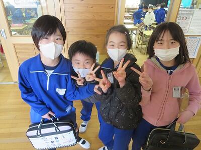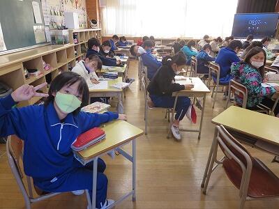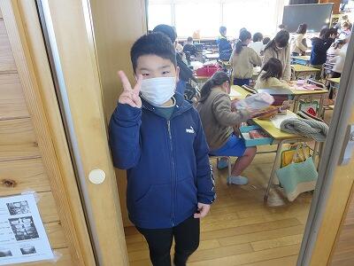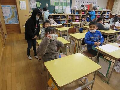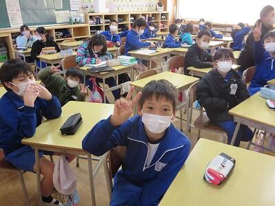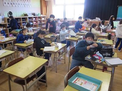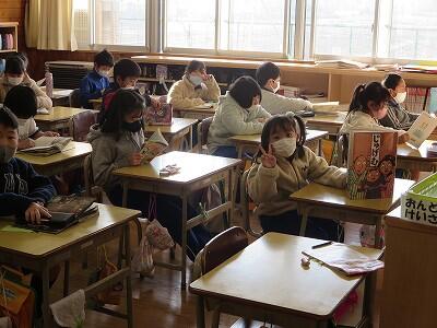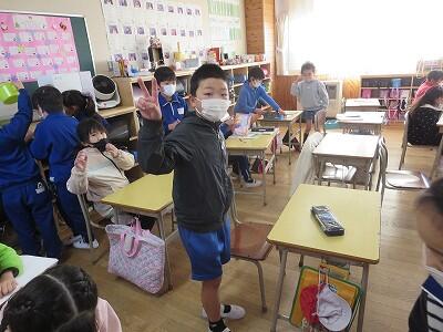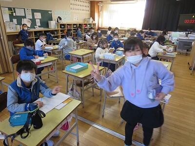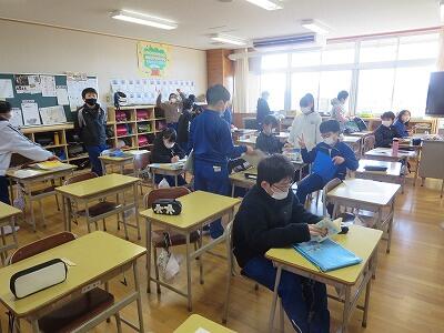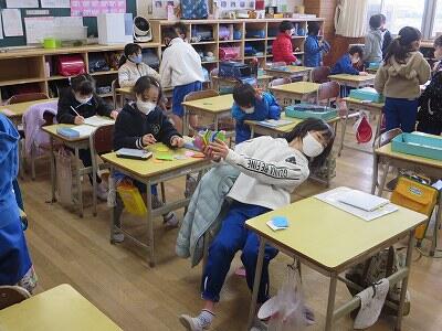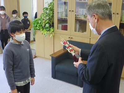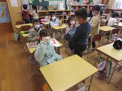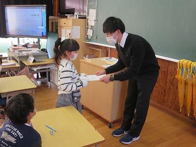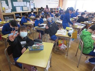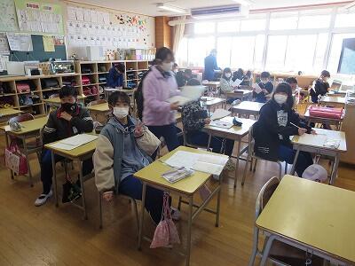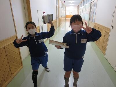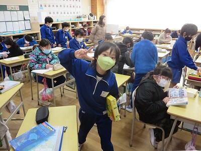 6年の学級委員が、5年の各教室に引き継ぎのあいさつと、ハンドルの贈呈をしてきました。