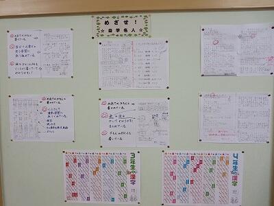 掲示板「めざせ、自学名人」、自主学習の例が示されています。