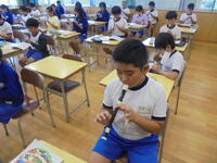 ★5年1組の「音楽」の授業では、一人一人が真剣な態度でリコーダーの練習に臨んでいました。
