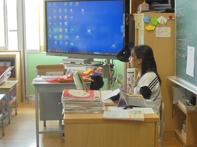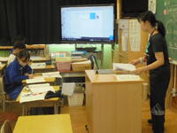 ★4年1組の「算数」では、二つの教室に分かれて学んでいました。