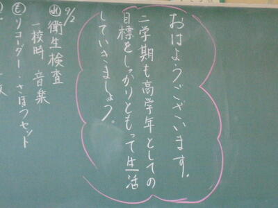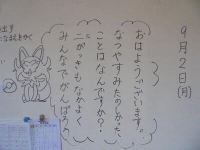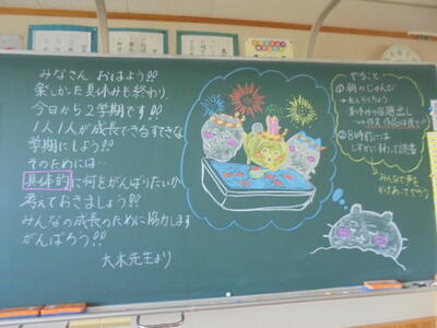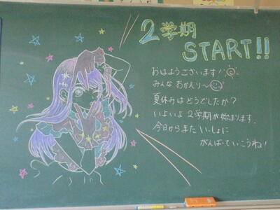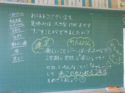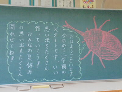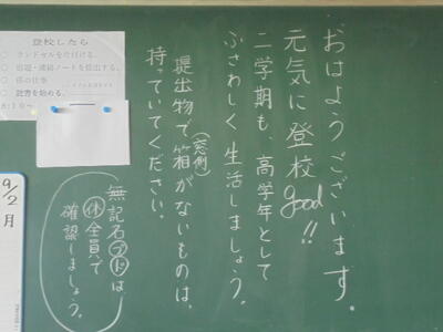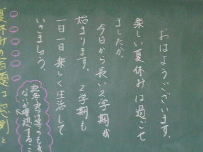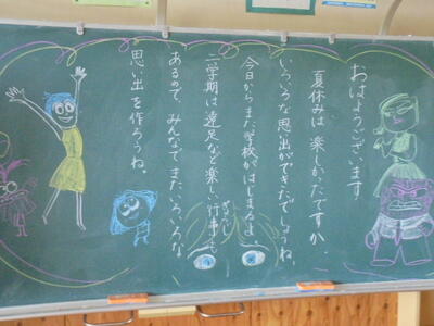 いくつかの教室をのぞいてみたら、黒板に担任の先生からの「メッセージ」が描かれていました。来週から始まる第2学期も、児童の皆さん一人一人が頑張って充実した学校生活を送って欲しいと願いながら、描き上げたのでしょうね(*^_^*)♪