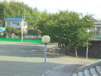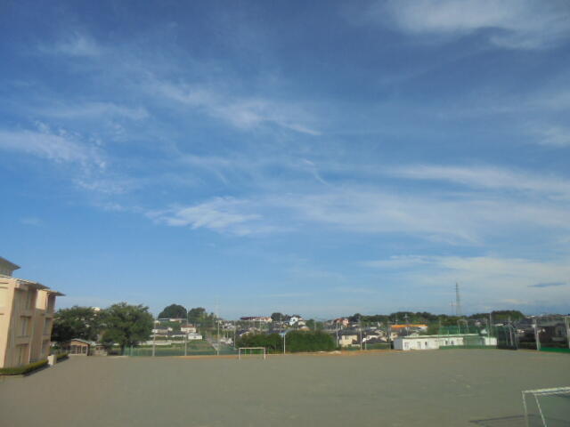 校舎から見た「朝の校庭」の風景です。
