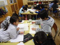 4年1組「国語」の授業では、班ごとに分かれて、調べたことを棒グラフに表したり、言葉を添えてまとめたりする等、視覚的に大変分かりやすい資料の作成に取り組んでいました。
